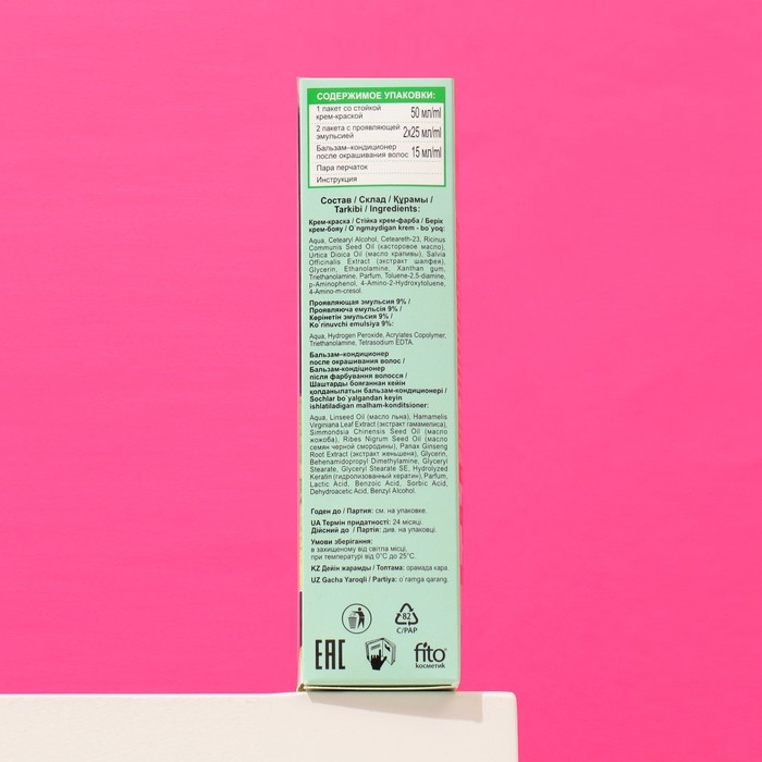 Крем-краска: Aqua, Cetearyl Alcohol, Ceteareth-23, Ricinus Communis Seed Oil (касторовое масло), Urtica Dioica Oil (масло крапивы), Salvia Officinalis Extract (экстракт шалфея), Glycerin, Ethanolamine, Xanthan gum, Triethanolamine, Parfum, Toluene-2,5-diamine, p-Aminophenol, 4-Amino-2-Hydroxytoluene, . 4-Amino-m-cresol.