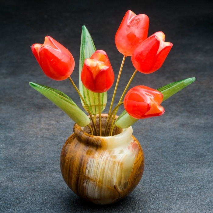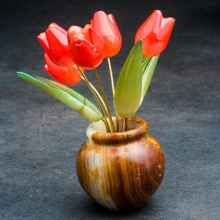 Сувенир «Тюльпаны в вазе», 5 цветков, малая, 9×12 см, селенит, оникс
