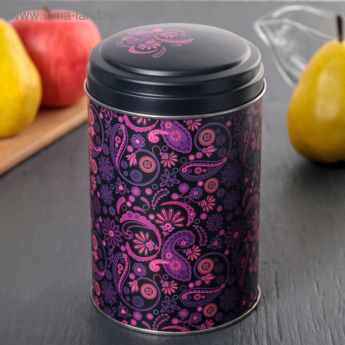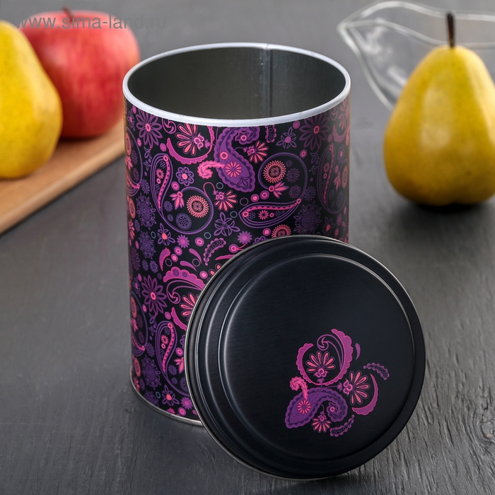 Банка для сыпучих продуктов изготовлена из жести. Крышка плотно закрывается и защищает еду от излишней влаги и проникновения посторонних запахов.