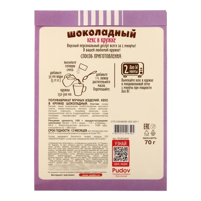 Мучная смесь «С.Пудовъ» кекс в кружке, шоколадный, 70 г