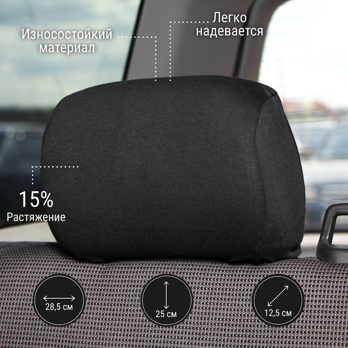 Чехлы на подголовник, черные, набор 2 шт преобразит салон автомобиля и защитит его от загрязнений. Изделие выполнено из хлопка с добавлением эластана. Такие материалы экологически безопасны и имеют высокую износостойкость: данная модель не мнётся и не вытягивается во время стирки и глажки, не выгорает на солнце, хорошо впитывает влагу.