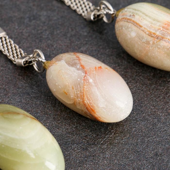 Оникс — уникальный камень со множеством цветовых сочетаний: чёрно-белым, красно-коричневым, коричнево-зелёным, бежево-жёлтым, жёлто-оранжевым и другими. Он может иметь контрастные прожилки из примесей других минералов, которые создают неповторимый узор.