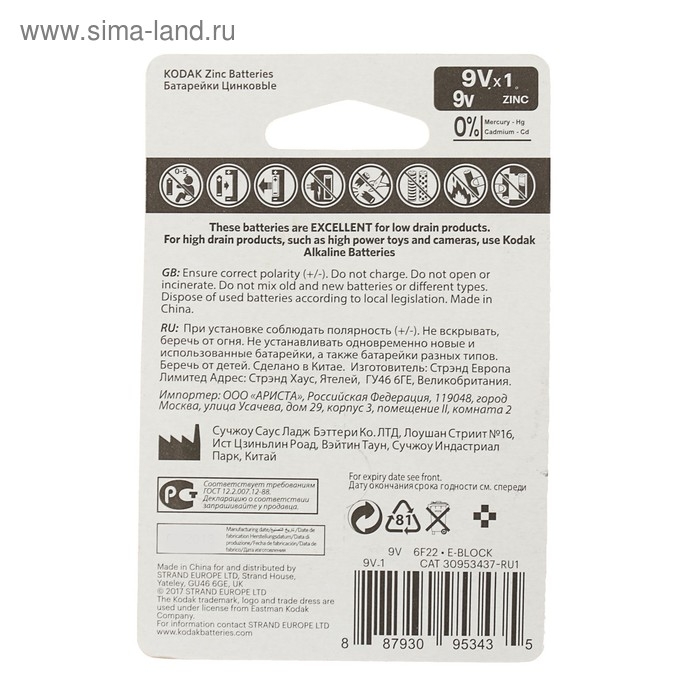 Батарейка солевая Kodak Extra Heavy Duty, 6F22-1BL, 9В, крона, блистер, 1 шт.