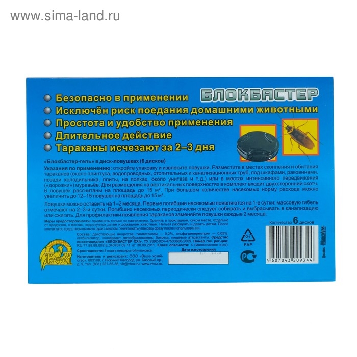 «Блокбастер XXI диск-ловушка» от тараканов. Срок эффективного действия до 60 дней, безопасно в применении, исключён риск поедания домашними животными, простота и удобство применения, длительное действие, тараканы исчезают за 2–3 дня.