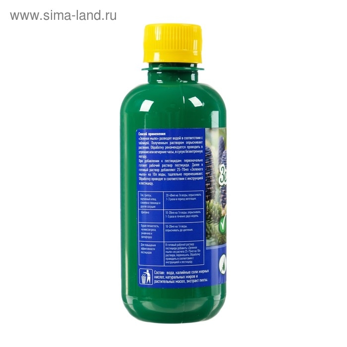 - Для повышения эффективности пестицида в готовый его раствор добавить «Зелёное мыло» из расчёта 25–75 мл на 10 л раствора, перемешать. Обработку проводить в соответствии с инструкцией к пестициду.