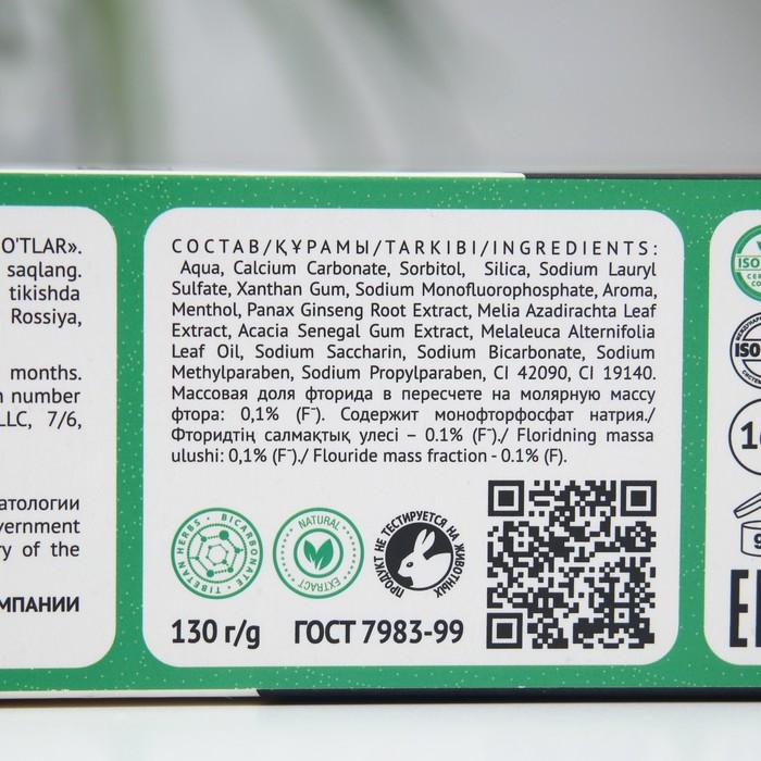 Состав: гидратированная силика, вода, карбонат кальция, сорбитол, натрия лаурилсульфат, ксантановая камедь, натрия монофторфосфат, ароматизатор, ментол, натрия сахаринат, натрия бикарбонат, экстракт женьшеня, экстракт нима, экстракт мели персидской, экстракт акации, масло чайного дерева, метилпарабен, пропилпарабен.