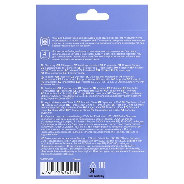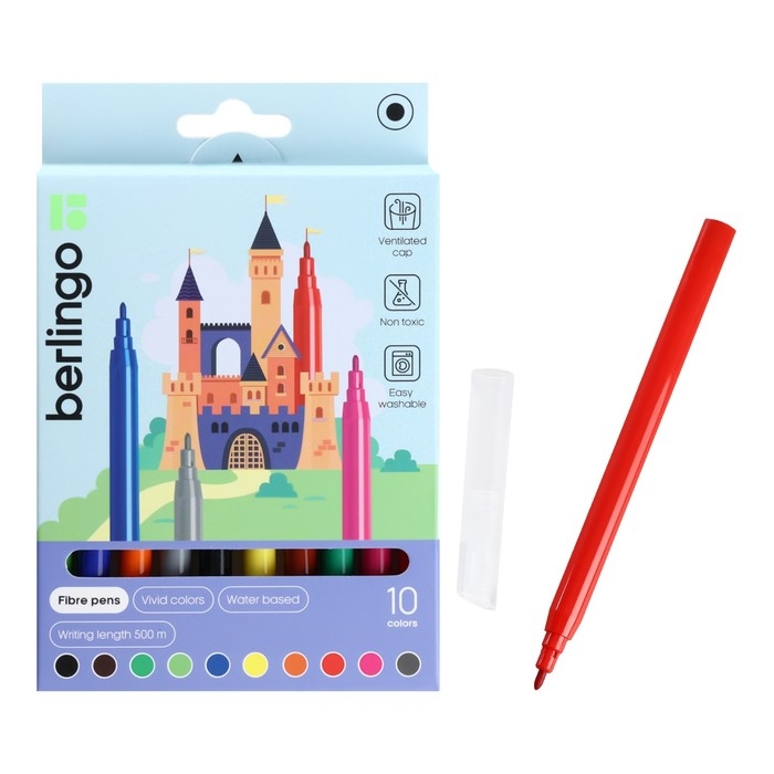 Легкосмываемые чернила, вентилируемый колпачок, нетоксичны, корпус изготовлен из полипропилена. Упакованы в картонную лакированную коробку с петлей-европодвесом. Длина линии не менее 500 м.