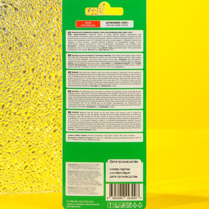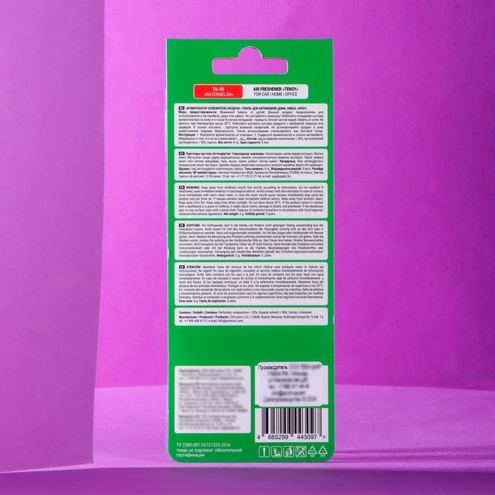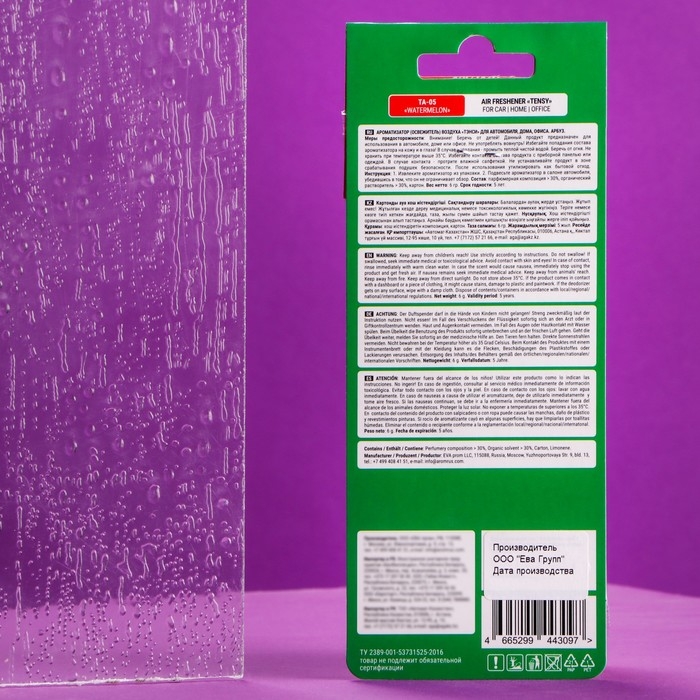 Создать неповторимую атмосферу комфорта в салоне любимого автомобиля очень просто! Достаточно наполнить воздух благоуханием. Подвесные ароматизаторы TENSY такие яркие и оригинальные, что не оставят ни одного автолюбителя равнодушным! Лёгкий освежающий аромат. Словно сочная холодная долька арбуза в жаркий летний день, напоминает о времени проведённым с близкими, когда яркие брызги летят и наполняют воздух ягодным запахом. Аромат создает легкое и позитивно-фруктовое настроение.