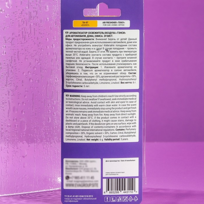 Создать неповторимую атмосферу комфорта в салоне любимого автомобиля очень просто! Достаточно наполнить воздух благоуханием. Подвесные ароматизаторы TENSY такие яркие и оригинальные, что не оставят ни одного автолюбителя равнодушным! Аромат нот парфюма с добавлением древесных нот эффективно маскирует навязчивые и неприятные запахи, создавая приятную атмосферу в салоне.