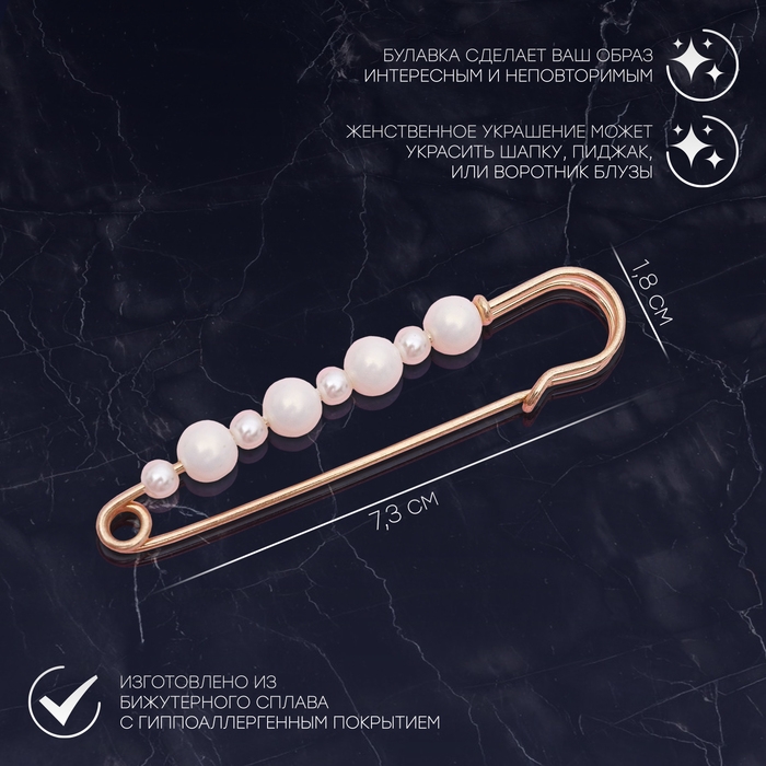 Данная булавка – настоящая находка для модниц, предпочитающих нетривиальные аксессуары. Брошь-булавка станет не только оригинальным дополнением вашего наряда, но и позволит без труда приколоть при необходимости палантин или шейный платок. Используйте её в качестве украшения шляпки, рубашки или галстука. Булавка «Жемчужная дорожка», 7,3 см, цвет белый в золоте внесёт особую нотку изящности в ваш образ.