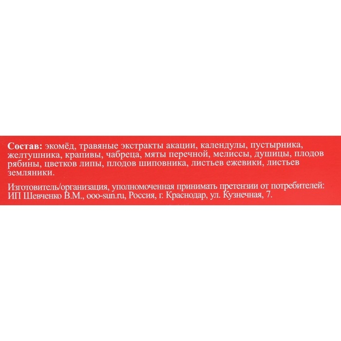 Состав: горный мёд, медовые экстракты: акация, календула, пустырник, желтушник, трава крапивы, чабрец, мята перечная, мелисса, душица, плоды рябины, цветки липы, плоды шиповника, листья ежевики, листья земляники.