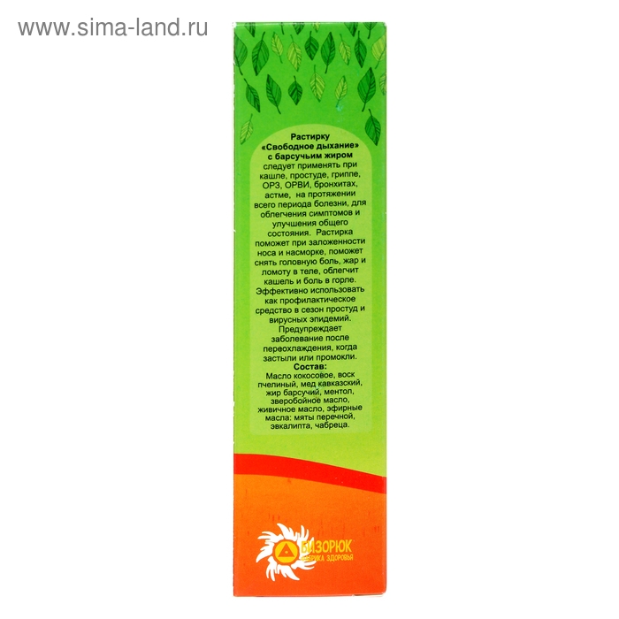 Состав: масло кокосовое, воск пчелиный, мед кавказский, жир барсучий, ментол, эфирное масло мяты перечной, зверобойное масло, эфирное масло эвкалипта, эфирное масло чабреца, живичное масло.