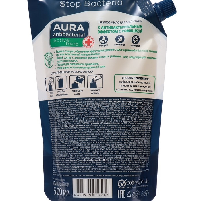 Описание: жидкое мыло Aura с антибактериальным эффектом Ромашка, 500 мл. Описание: жидкое мыло Aura с антибактериальным эффектом Ромашка эффективно очищает кожу, не травмирует и не сушит её.