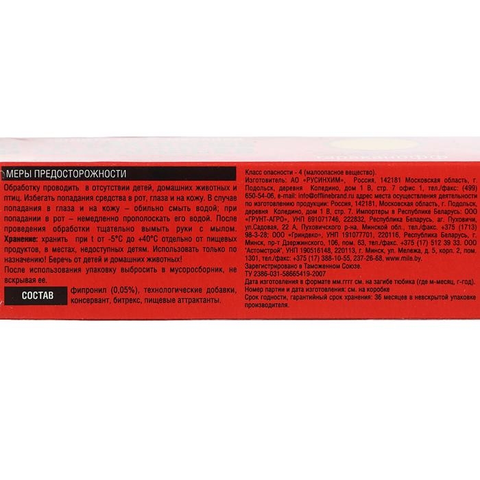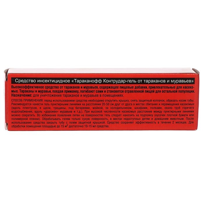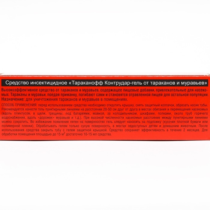 Профессиональная защита от ползающих насекомыхСодержит пищевой аттрактант, Приманивающий насекомых.Насекомое, поедая средство, погибает в течение 24 часов само и становится отравленной пищей для сородичей. Уничтожается вся популяция.Средство сохраняет эффективность в течение 2 месяцев.Экономичное использование – 75 мл на 110 м2.Не оставляет следов на поверхностях.СПОСОБ ПРИМЕНЕНИЯСнять защитный колпачок и обрезать носик тубы.Нанести гель пунктирными линиями на расстоянии 20-50 друг от друга в местах обитания и передвижения тараканов и муравьев: вдоль плинтусов, под батареями, мойкой, за холодильником, шкафами, полками, вдоль «дорожек» муравьев и т.д.)Для обработки помещения 15 м2, достаточно 10-15 мл средства.Длинный и удобный носик тубы для обработки труднодоступных мест.СОСТАВфипронил (0,05%)технологические добавкиконсервантбитрекс