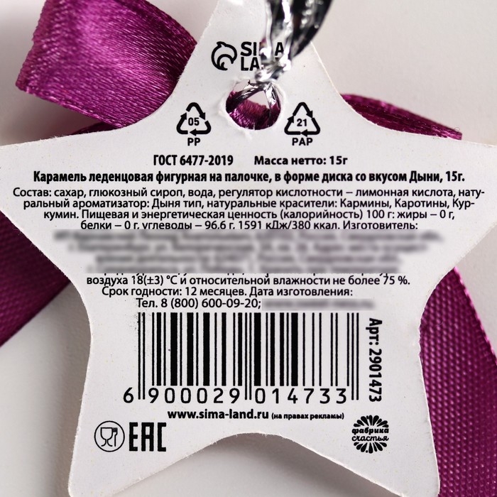 Состав: сахар, патока, вода, регулятор кислотности – лимонная кислота, натуральный ароматизатор «Дыня», натуральные красители: кармин, Б-апокаротиновый альдегид, куркумин, Б-каротин. Масса нетто: 15 г. Срок годности: 12 мес.