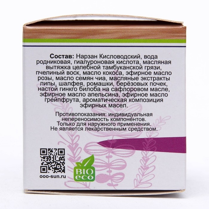 Активные компоненты: нарзан кисловодский (скважина 7-РЭ), вода родниковая, гиалуроновая кислота НА-T 1-1.8 МDa, масляная вытяжка целебной тамбуканской грязи, белый воск, масло кокоса, масло сафлоровое, масло семян чиа, масляные экстракты липы, шалфея, ромашки, берёзовых почек, настой гинкго билоба, эфирное масло апельсина, эфирное масло грейпфрута.