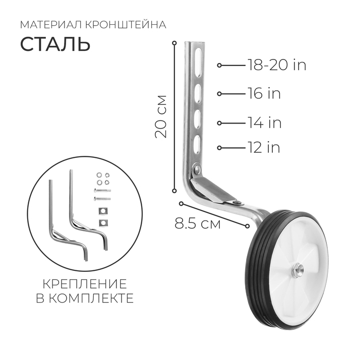 Дополнительные колёса помогают ребёнку на начальных этапах обучения, чтобы он смог без риска падения привыкнуть к детскому велосипеду. Универсальный кронштейн позволяет использовать их на моделях с задним переключателем.