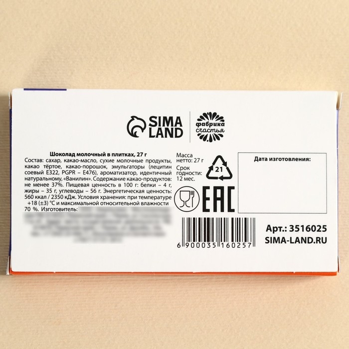 Состав: сухое цельное молоко, какое тёртое, масло какао, сухая молочная сыворотка, обезвоженный молочный жир, сахар, эмульгатор: соевый лецитин, ароматизатор, идентичный натуральному «Ванилин».