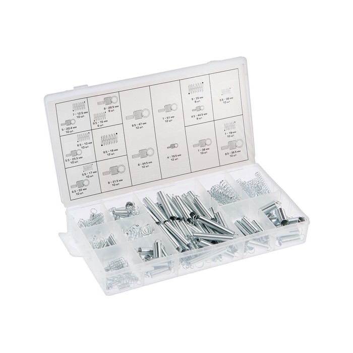 В комплекте представлены инструментальные пружины и пружины общего назначения. Набор поставляется в кейсе для удобного хранения.