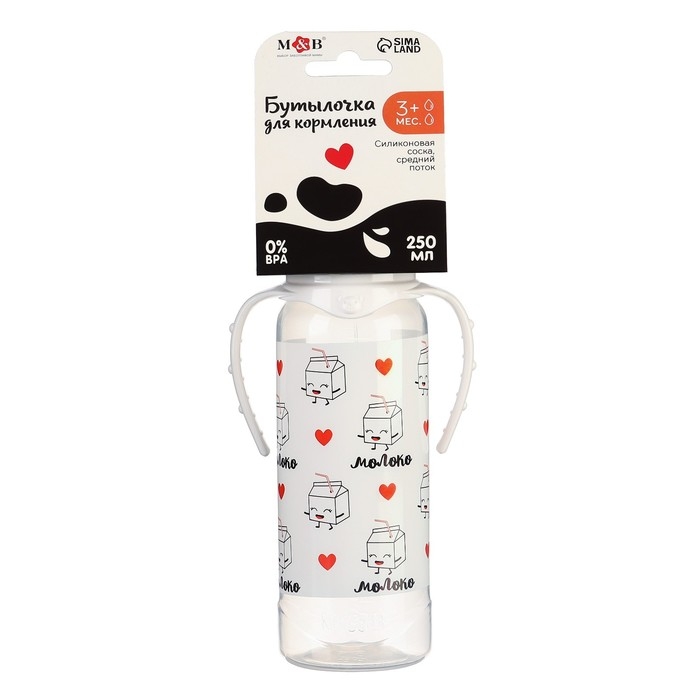 Бутылочка для кормления «Люблю молоко», классическое горло, с ручками, 250 мл., от 3 мес., цвет белый