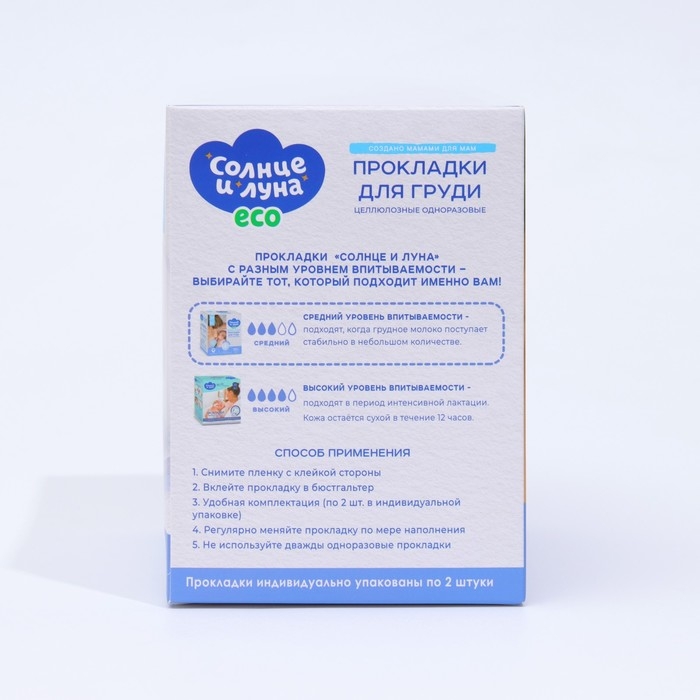 Описание: одноразовые прокладки на грудь для кормящих мам "Солнце и Луна" позволяют облегчить уход за грудью во время лактации. Ультратонкие прокладки "Солнце и луна" отлично впитывают и обеспечивают надежную защиту благодаря специально разработанной многослойной структуре: Супердышаший мягкий нетканый материал всегда остается сухим, предотвращая раздражение и обеспечивая доступ кислорода к коже. Воздухопроницаемый материал поглощает влагу и не дает жидкости выйти наружу.