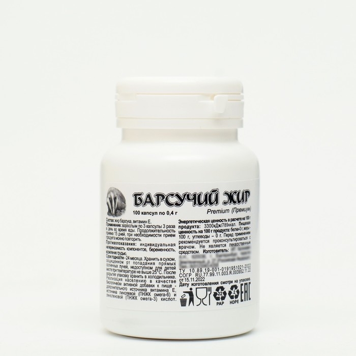 Барсучий жир - профилактическое средство от кашля, простуды, гриппа, отводит мокроты из бронхов, обладает общеукрепляющим, бактерицидным , противовоспалительным свойством. В барсучьем жире содержится олеиновая кислота, она положительно влияет на сердечно-сосудистую систему, он полезен людям, страдающим ожирением, сердечно –сосудистыми заболеваниями.