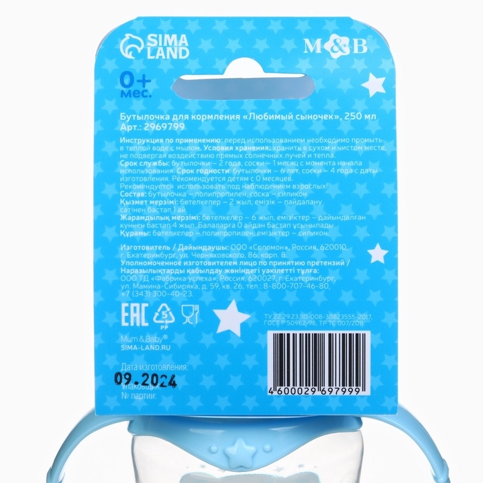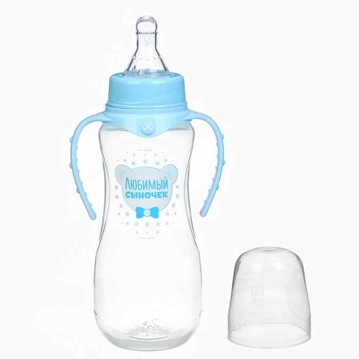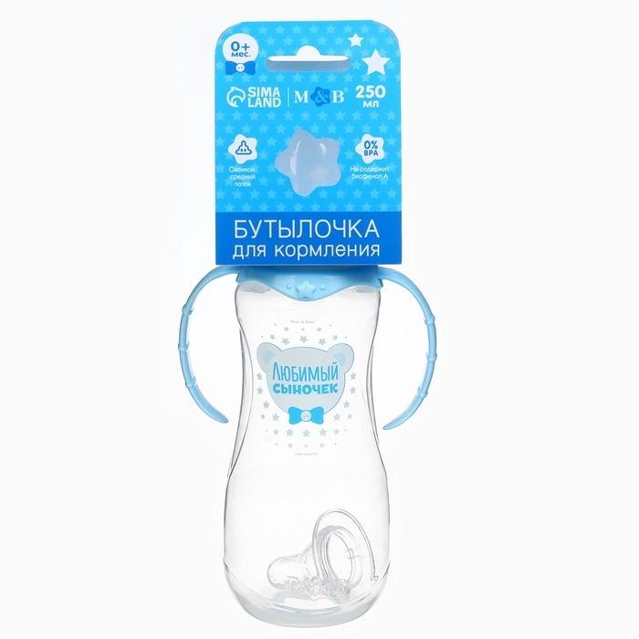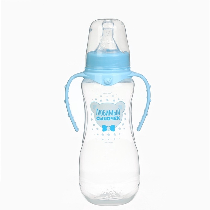 Бутылочка для кормления «Любимый сыночек», классическое горло, приталенная, с ручками, 250 мл., от 0 мес., цвет голубой