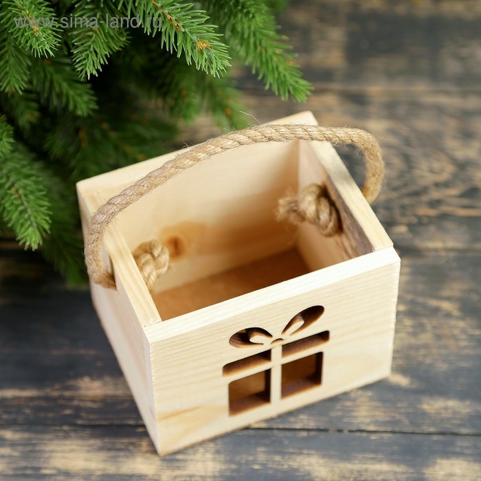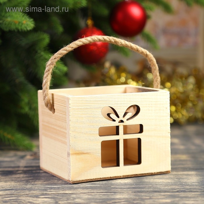 Кашпо деревянное "Новогодний подарок", ручка- шнур, 12,5х10,5х9,5см