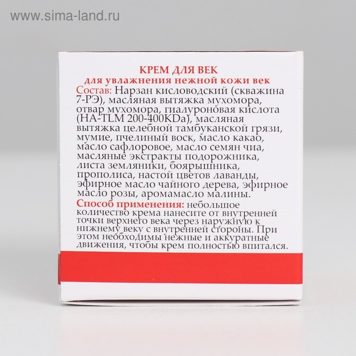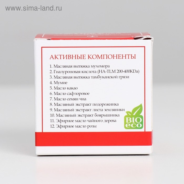 Состав: нарзан кисловодский (скважина 7-РЭ), масляная вытяжка мухомора, отвар мухомора, гиалуроновая кислота НА-TLM 200–400KDa, масляная вытяжка целебной тамбуканской грязи, мумиё, белый воск, масло какао, масло сафлоровое, масло семян чиа, масляные экстракты подорожника, листа земляники, боярышника, прополиса, настой цветов лаванды, эфирное масло чайного дерева, эфирное масло розы.