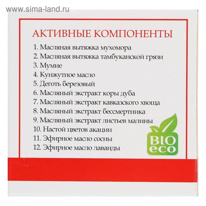 Состав: нарзан кисловодский (скважина 7-РЭ), масляная вытяжка мухомора, отвар мухомора, масляная вытяжка целебной тамбуканской грязи, мумиё, белый воск, масляные экстракты коры дуба, коры берёзы, кавказского хвоща, бессмертника, листьев малины, конского каштана, кунжутное масло, деготь берёзовый, настой цветов акации, эфирное масло сосны, эфирное масло лаванды.