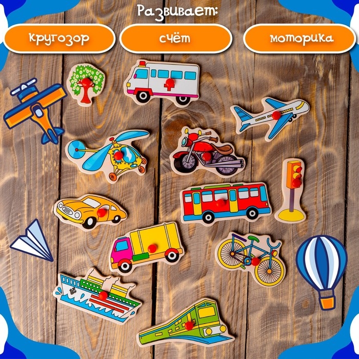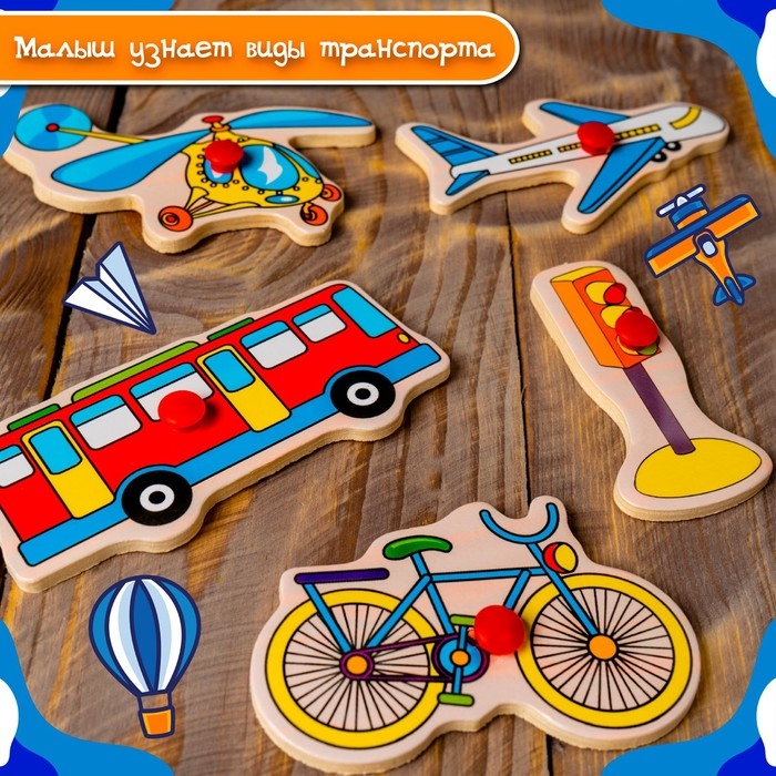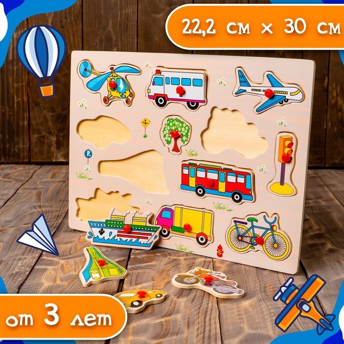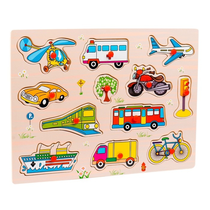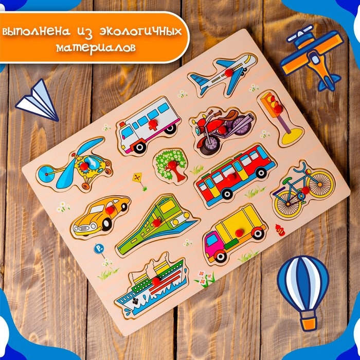 Рамка-вкладыш «Транспорт» поможет ребёнку научиться разделять фишки по категориям, а также расширит его кругозор. Малыш узнает много разных видов транспорта: наземный, воздушный, водный.