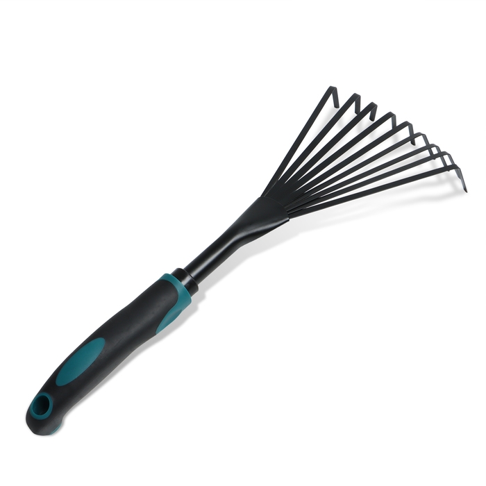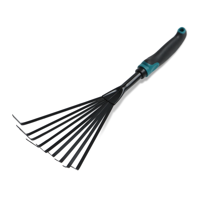 Грабли малые, веерные, пластинчатые, 9 зубцов, длина 52 см, металл, металлическая рукоять с резиновой ручкой, Greengo