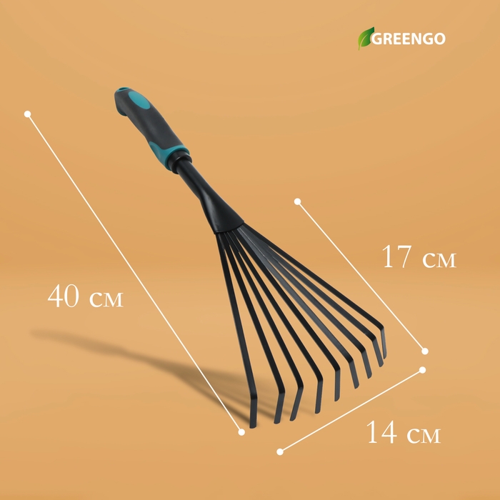 Грабли малые, веерные, пластинчатые, 9 зубцов, длина 40 см, эргономичная прорезиненная ручка, Greengo
