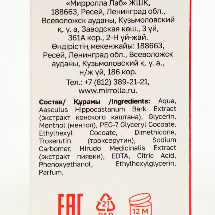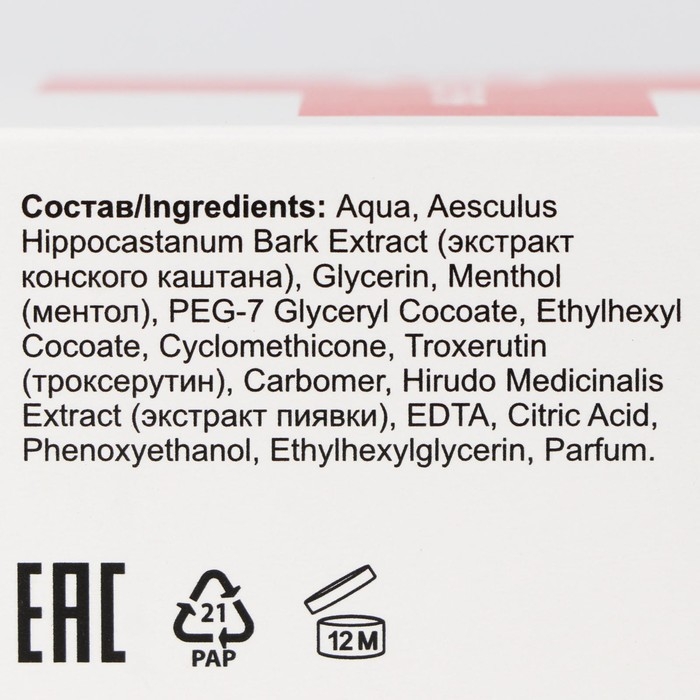 Состав: aqua, aesculus hippocastanum bark ex¬tract (экстракт конского каштана), glycerin, menthol (ментол), peg-7 glyceryl cocoate, eth- ylhexyl cocoate, cyclomethicone, troxerutin (троксерутин), carbomer, hirudo medicinalis extract (экстракт пиявки), edta, citric acid, diazolidinyl urea, 2-bromo-2-nitropro- pane-1,3-diol, parfum.