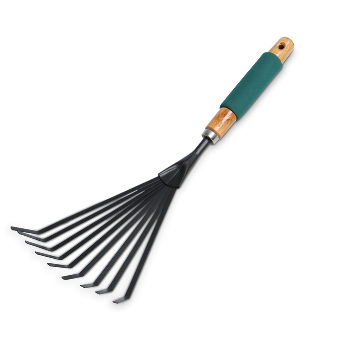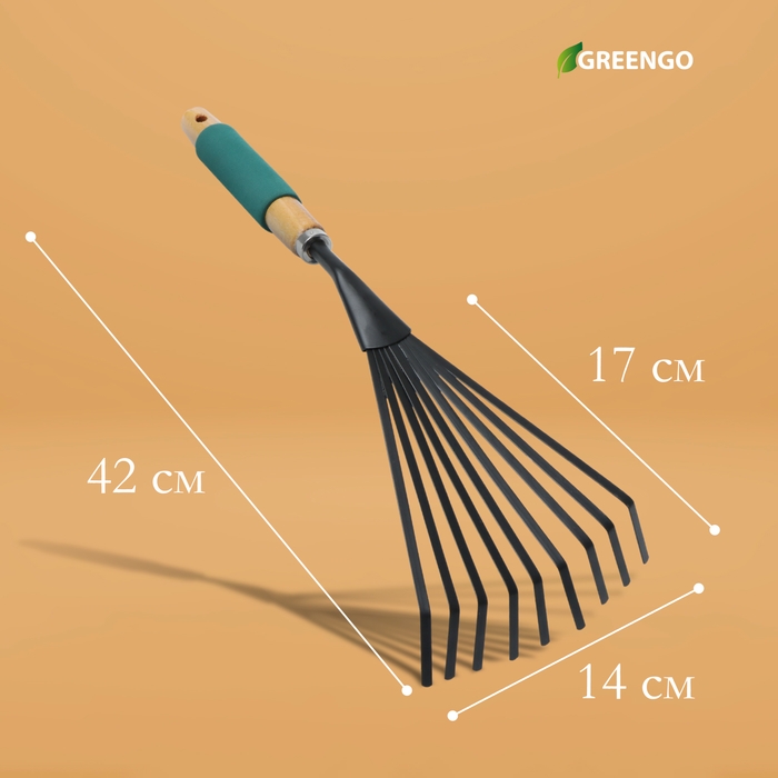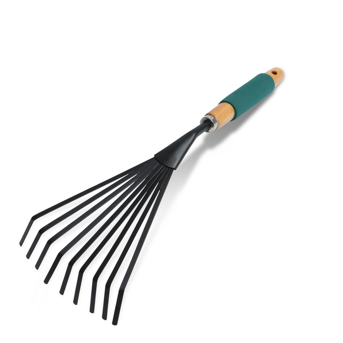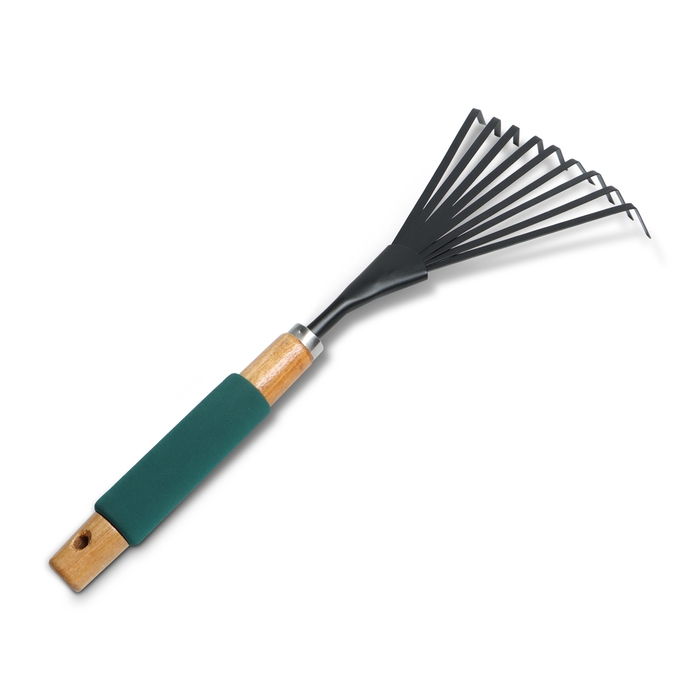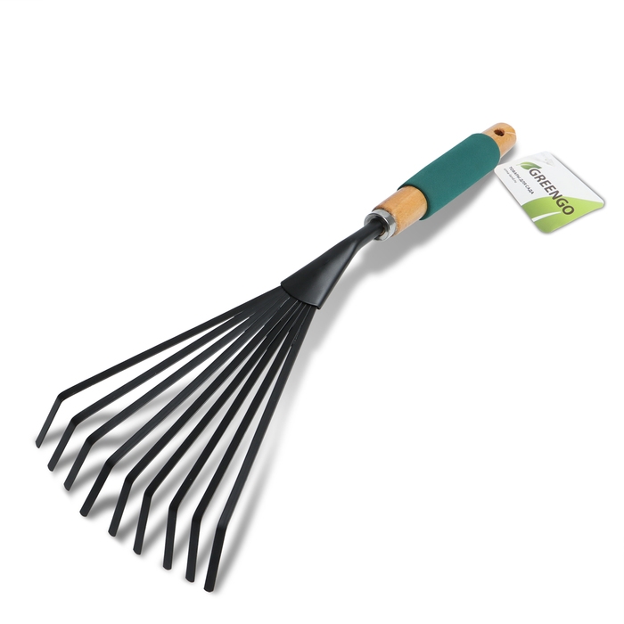Грабли малые, веерные, пластинчатые, 9 зубцов, длина 42 см, металл, деревянная ручка с поролоном, Greengo