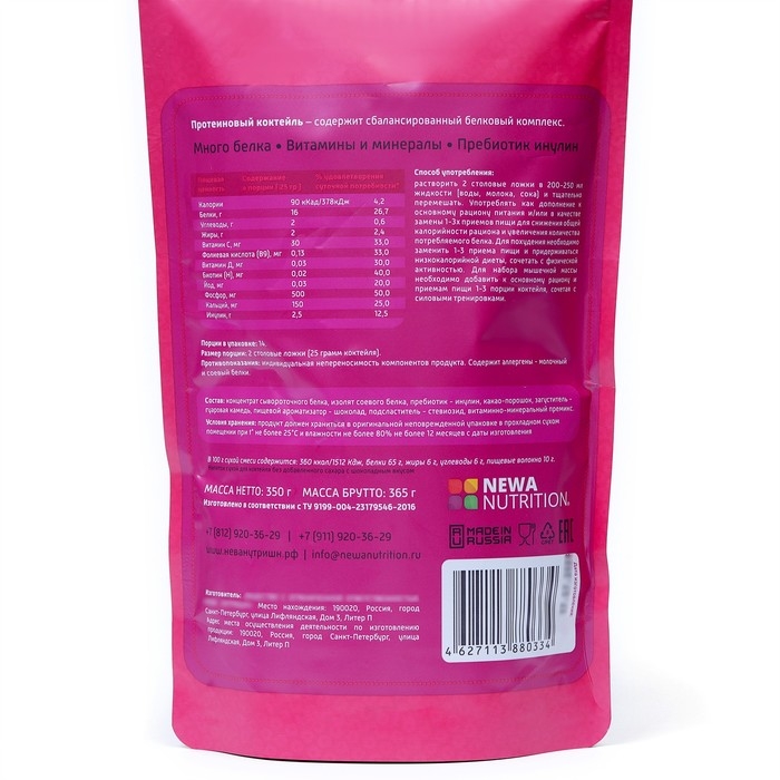 Состав: Концентрат сывороточного белка, изолят соевого белка, инулин,какао-порошок, гуаровая камедь, ароматизатор пищевой шоколад, подсластитель-стевиозид, витаминно-минеральный премикс.