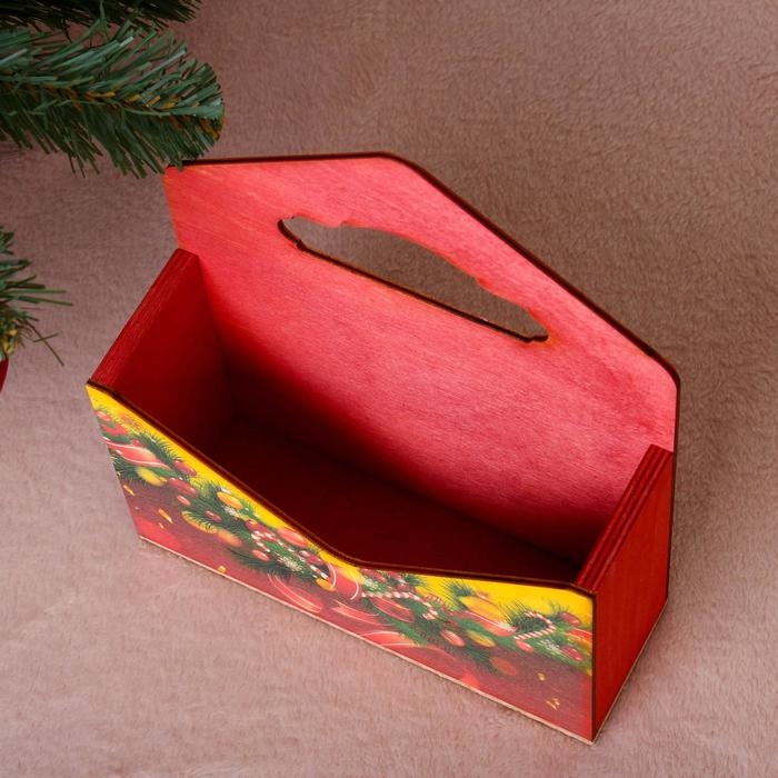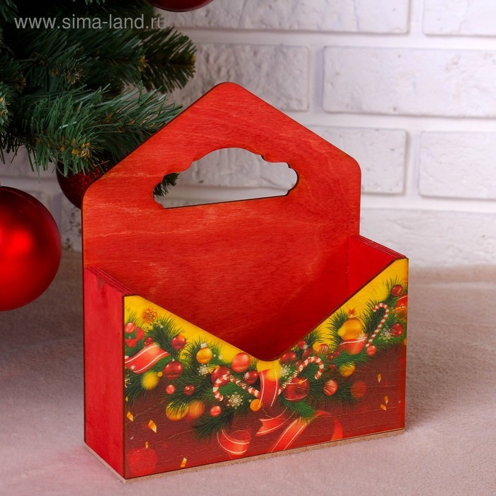 Кашпо деревянное "Конверт, Новогодний №4", деревянная ручка, красное, 20,5×18×6 см