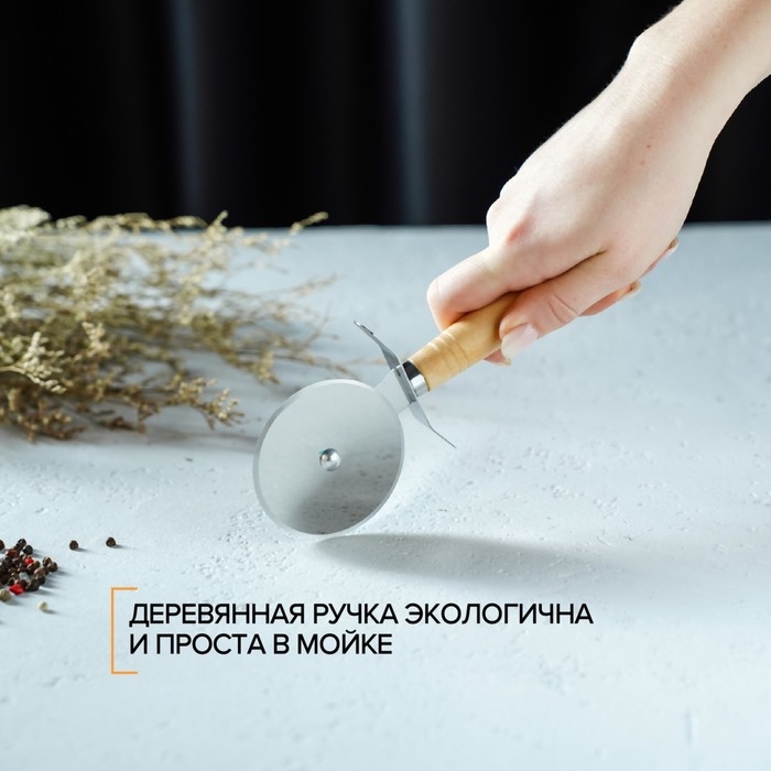 Нож для пиццы — универсальный кухонный инструмент, который не только легко разрезает готовую выпечку, но и помогает поделить на слайсы липкое тесто. Нож имеет эргономичную форму ручки и острое круглое лезвие. Колесо, прикреплённое к рукояти, продавливает продукт, а не разрезает его в отличие от классического ножа. Благодаря такому способу тесто разрезается, а начинка остается на месте.