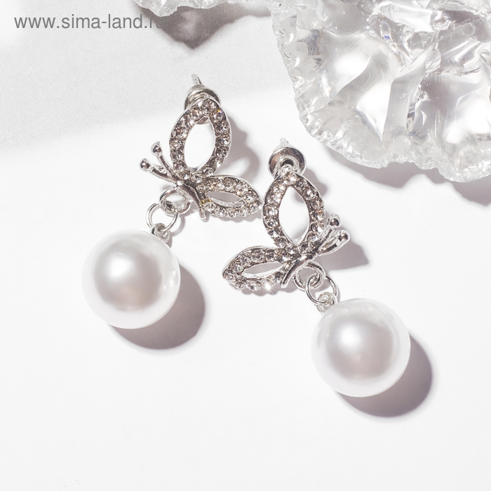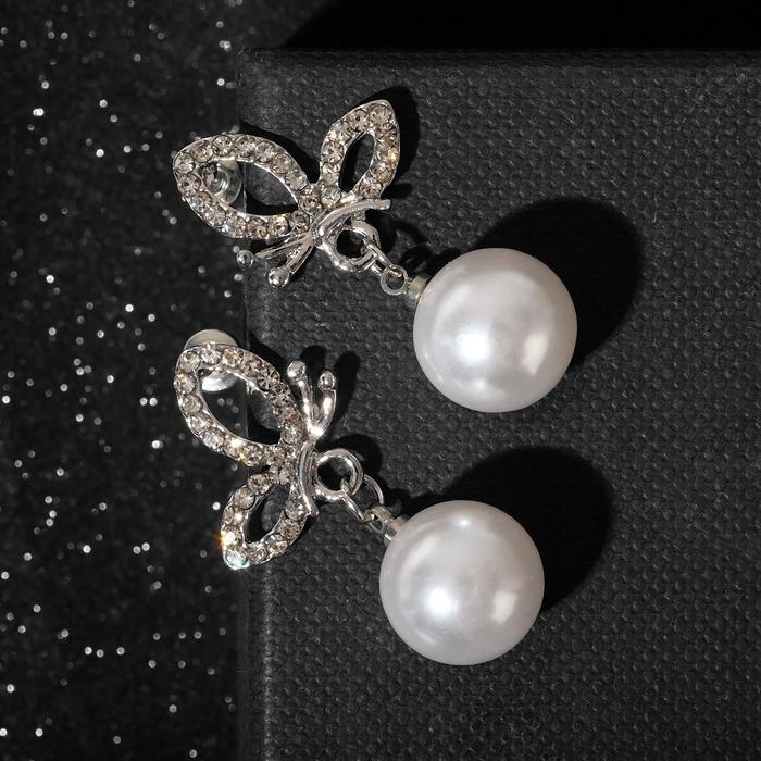 Серьги с жемчугом «Бабочка» с бусиной, цвет белый в серебре