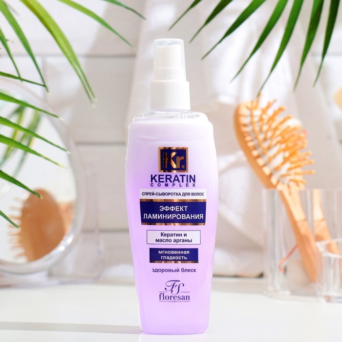 Спрей-сыворотка двухфазной структуры с кератином и маслом арганового дерева быстро и эффективно восстанавливает, защищает и увлажняет волосы. Гидролизованный кератин оказывает восстанавливающий эффект изнутри, а масло арганового дерева защищает волосы даже при обработке феном. Спрей-сыворотка обволакивает каждый волос, сглаживает чешуйки, выравнивает, создает эффект глянцевой поверхности и восстанавливает объем по всей длине волос.