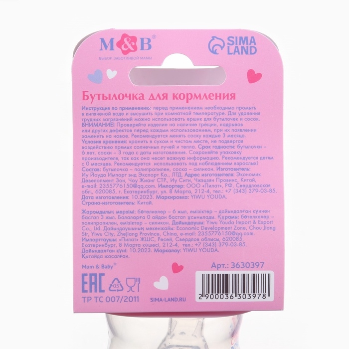 Детская бутылочка изготовлена в России из сырья отечественного производства. Все материалы сертифицированы и безопасны для здоровья новорождённых. Полипропилен и силикон не выделяют вредных веществ при стерилизации и контакте с жидкостью.