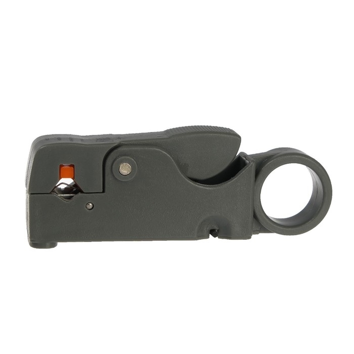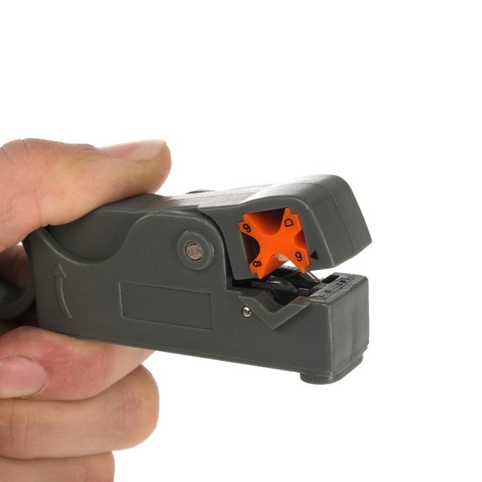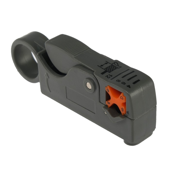 Универсальный стриппер для снятия изоляции с коаксиальных кабелей. Подходят для кабелей RG6 (6), RG58 (8), RG59/RG62 (9), RG174 (D), также для снятия изоляции с витой пары и обычных проводов с сечением жилы больше 6 мм.кв. Вылет лезвий регулируется двумя установочными винтами в нижней части стриппера.