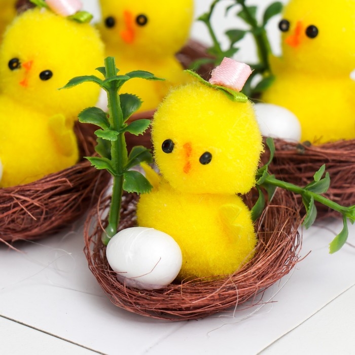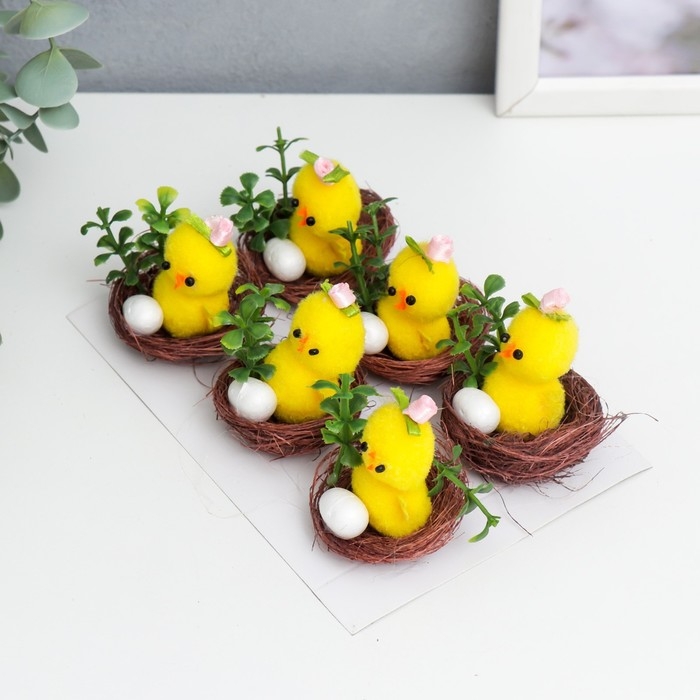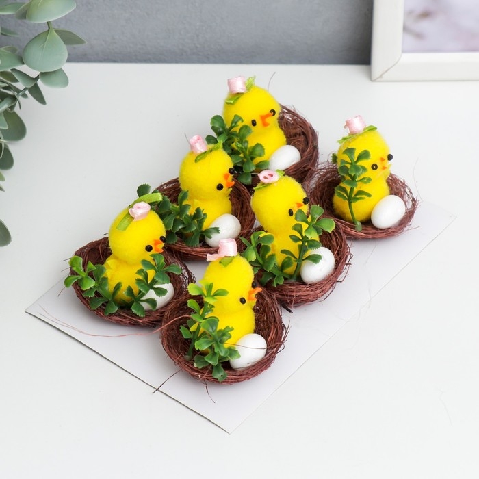 Сувенир пасхальный "Цыплёнок с розой и яичком в гнезде с цветком" набор 6 шт 3х4х4 см