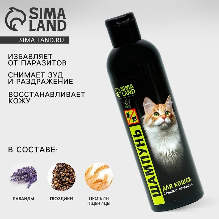 Антипаразитарный шампунь для кошек с пшеничным протеином, маслом гвоздики и экстрактом лаванды.