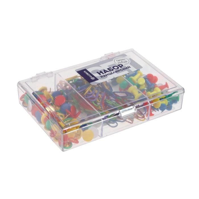 Набор канцелярский из 3-х предметов (скрепки 28 мм цветные - 70 шт, кнопки силовые цветные - 40 шт, кнопки цветные - 70 шт.)