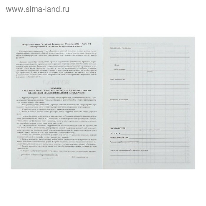 Журнал учёта работы педагога дополнительного образования в объединении (секции, клубе, кружке) А4, 20 листов, обложка офсет 120 г/м², блок писчая бумага 60 г/м²