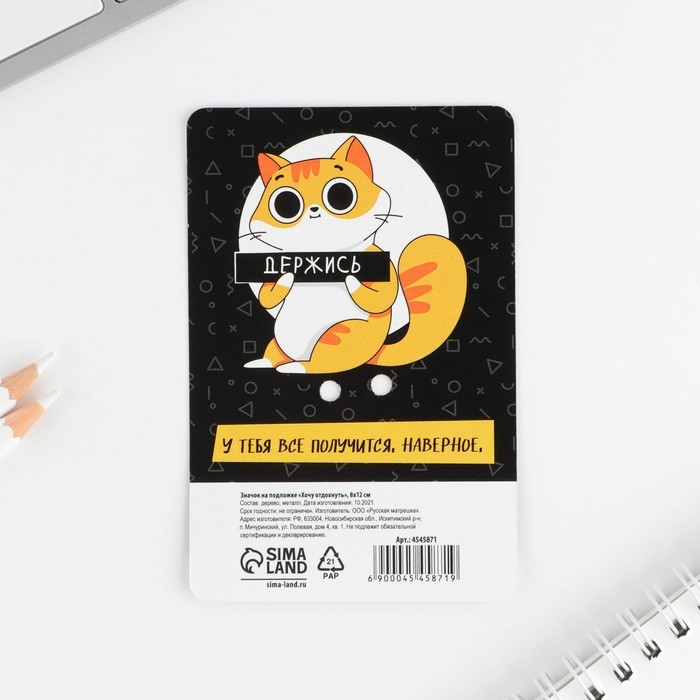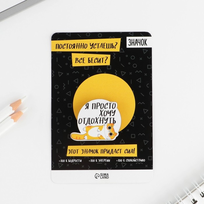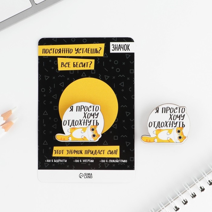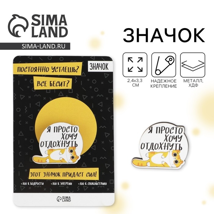 Значок «Хочу отдохнуть». Яркий способ выделить себя в толпе, показать свою индивидуальность. Значок лёгкий и долговечный, надежно и безопасно крепится с помощью булавки к одежде, что позволяет использовать его без ограничений для всех возрастных категорий.