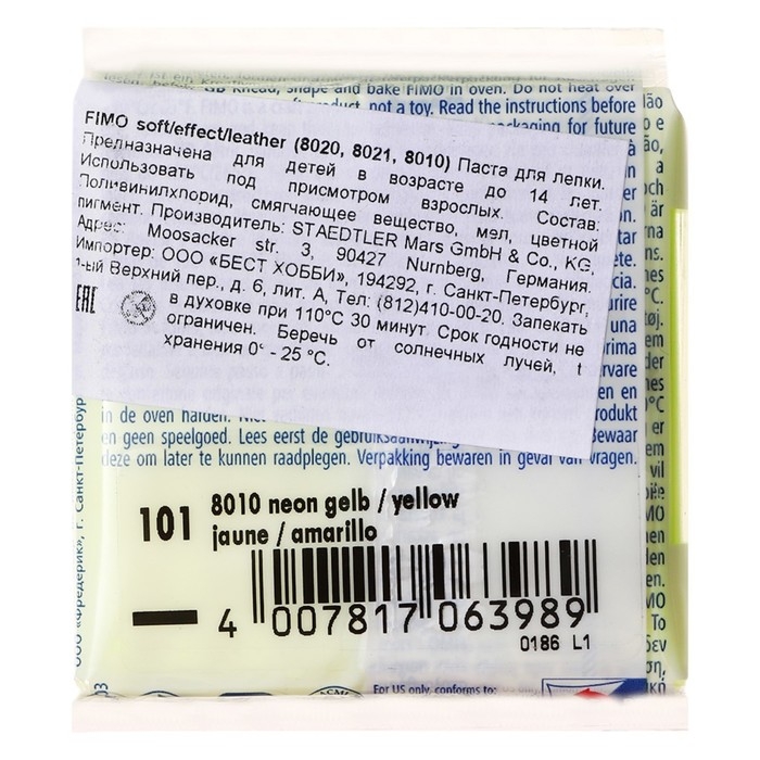 Полимерная глина FIMO подходит для начинающих мастеров и професиональных художников.ОсобенностиМасса мягкая, поэтому вы легко придадите ей нужную форму.Цвета можно смешивать для получения необходимых оттенков, которые сохранятся после обжига.После запекания изделия становятся прочными и долговечными.Упаковка легко открывается без использования ножа. Если вы не полностью израсходовали блок, то остатки можно завернуть в упаковку — так глина лучше сохранится.Термическая обработка. Готовое изделие поместите внутрь духовки на тарелке, стекле или фольге. Температура обжига не должна пpeвышaть 130 °С.Пластика рекомендована для детей старше 8 лет.