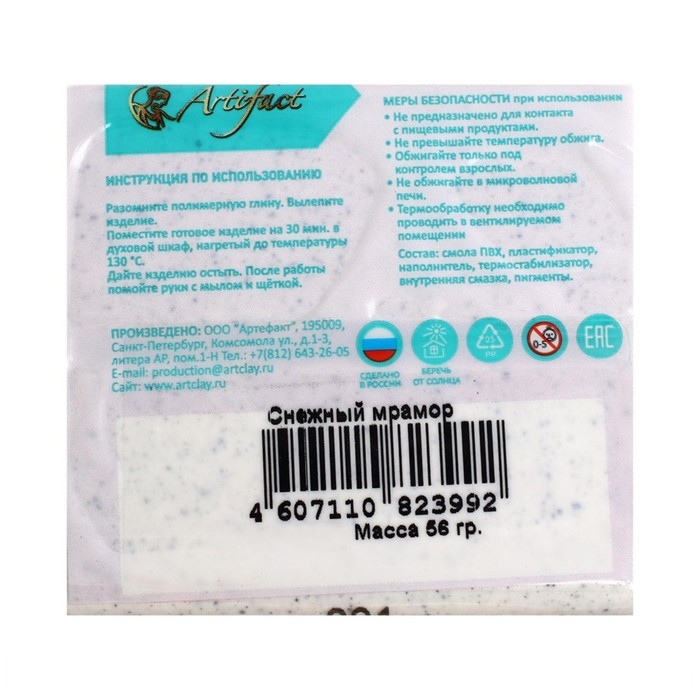 Artifact — первый в России производитель полимерной глины, который выпускает качественные и безопасные материалы для лепки и моделирования.Полимерная глина Artifact — это оптимальный вариант для того, чтобы познакомиться с материалом и сделать первый шедевр. Цвет не меняется после запекания. Легко смешивается с другими для получения ярких оттенков.По внешнему виду и своей податливости полимерная глина похожа на пластилин, а после запекания превращается в твёрдую пластмассу. С её помощью можно изготовить мельчайшие детали. Работать с полимерной глиной легко: изделие нужно только слепить и запечь.Обожжённые поделки хранятся длительное время. Готовые изделия можно мыть и протирать влажной салфеткой. Состав полимерной глины подобран таким образом, чтобы при хранении она не твердела, при лепке не крошилась и не пачкалась, а после запекания не ломалась. Материал безопасен, с ним может работать даже ребёнок.Подходит для профессионального использования. Рекомендовано для детей от 5 лет.