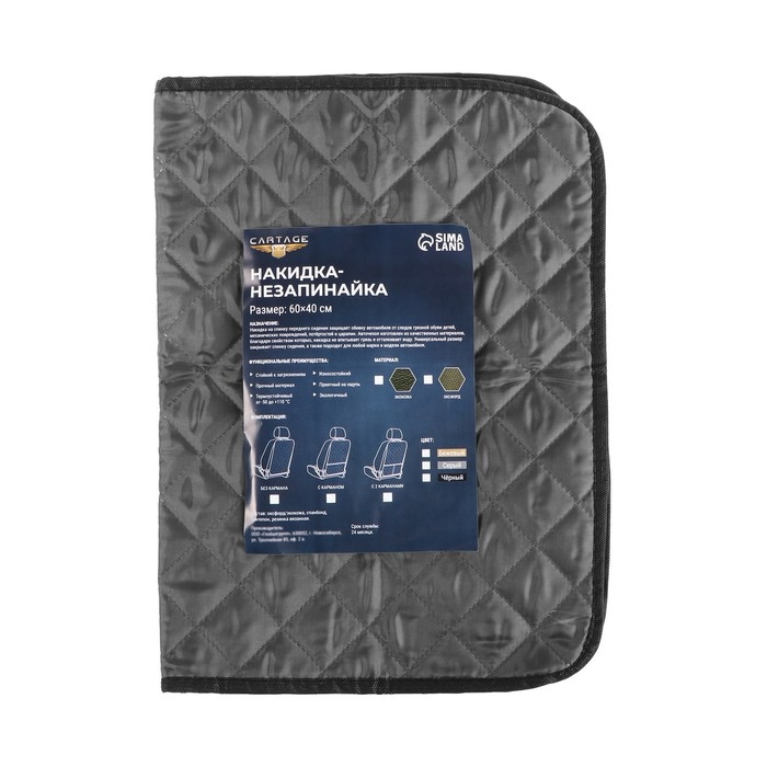 Накидка-незапинайка Cartage – это практичное и стильное решение для защиты спинки сиденья автомобиля от грязи, пыли и повреждений. Выполненная из высококачественного материала оксфорд, накидка обладает прочностью и износостойкостью, обеспечивая длительный срок службы. Размеры накидки составляют 40 см в ширину и 60 см в длину, что позволяет легко и быстро закрепить ее на спинке сиденья, не создавая помех при использовании ремней безопасности. Наличие кармана предоставляет дополнительное пространство для хранения мелких предметов или денег. Благодаря универсальному серому цвету накидка подходит для любого типа автомобиля и легко вписывается в интерьер салона.